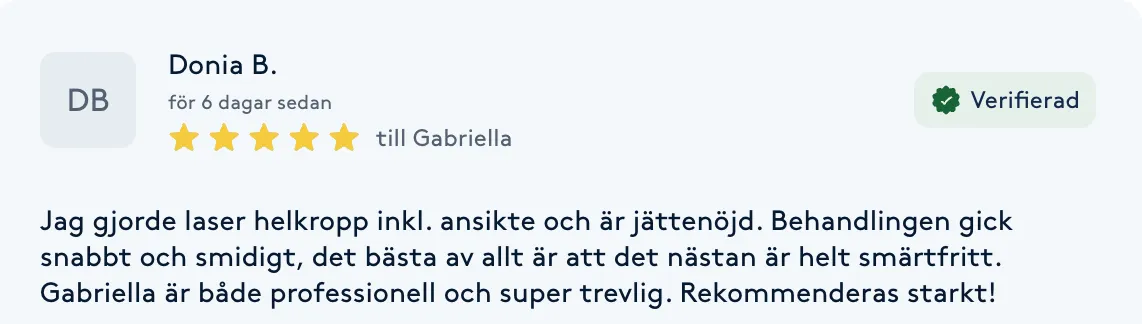 Jag gör en bedömning av din hudtyp för att säkerställa att behandling kan utföras på korrekt sätt, samt att inga kontraindikationer finns.